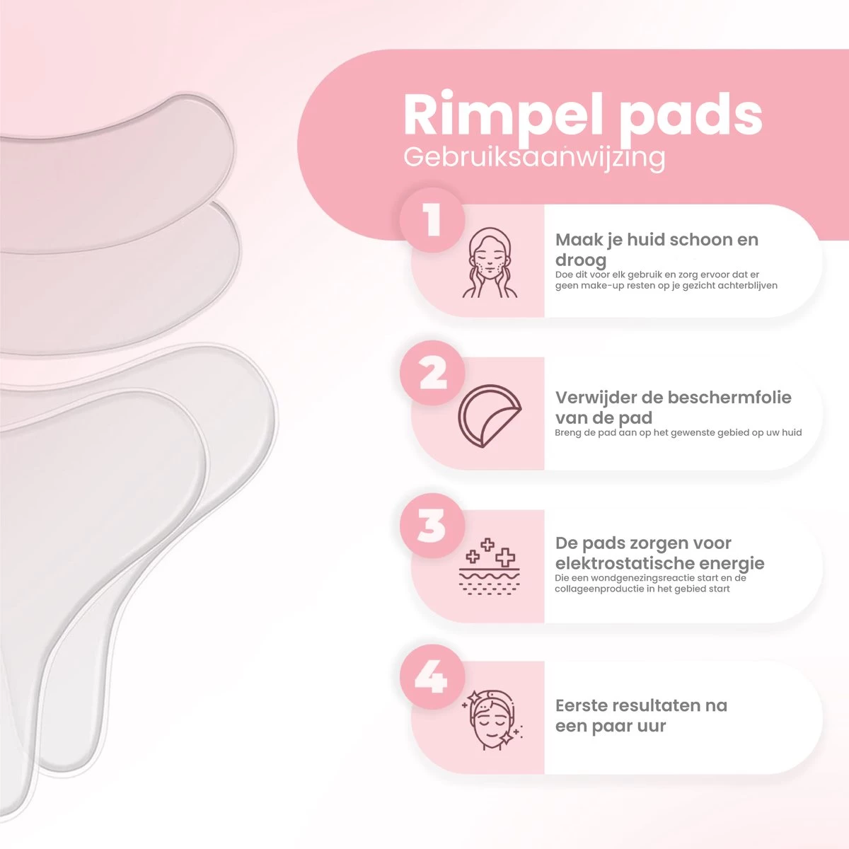 Wanneer de rimpel pads aangebracht worden begint de huid collageen aan te maken, ook wordt de huid gehydrateerd. Hierdoor wordt je weer wakker met een soepele en zachte huid!