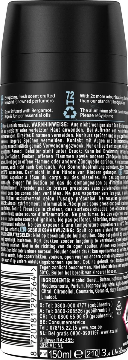 Breng fris blijven naar een hoger niveau. Leef dat dagelijkse frisse leven. Je weet nooit wat er kan gebeuren, dus heb je een deodorant bodyspray nodig die ervoor zorgt dat je de hele dag heerlijk ruikt, elke dag weer. Met AXE Fine Fragrance Collection Aqua Bergamot Premium Deodorant Bodyspray ruik je onweerstaanbaar. Deze bodyspray met de onweerstaanbare geur van bergamot, salie en jeneverbes is net zo fris als een luxe parfum! En AXE Fine Fragrance Aqua Bergamot Premium Deodorant Bodyspray beschermt je daarbij ook nog eens 72 uur lang tegen ongewenste lichaamsgeur.