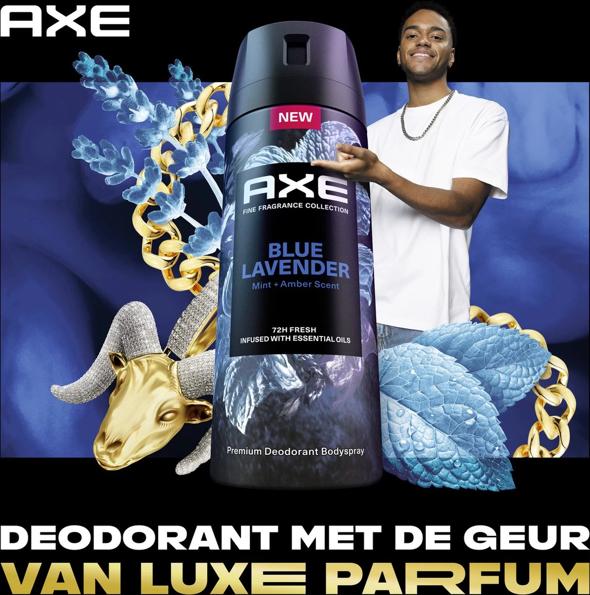 AXE Fine Fragrance Collection Blue Lavender Premium Deodorant Bodyspray met de geur van lavendel, mint en amber ruikt als een luxe parfum en beschermt effectief tegen lichaamsgeur als een deo.