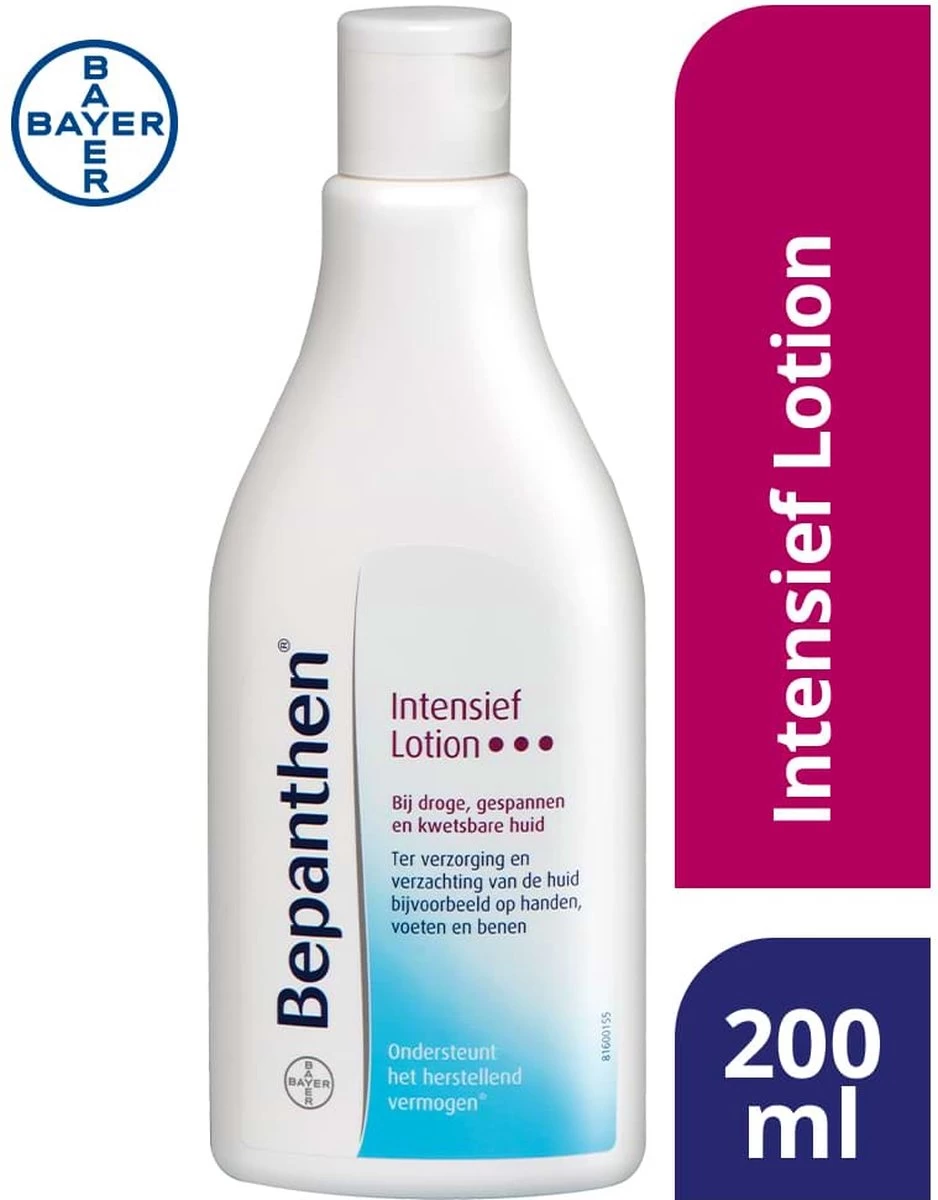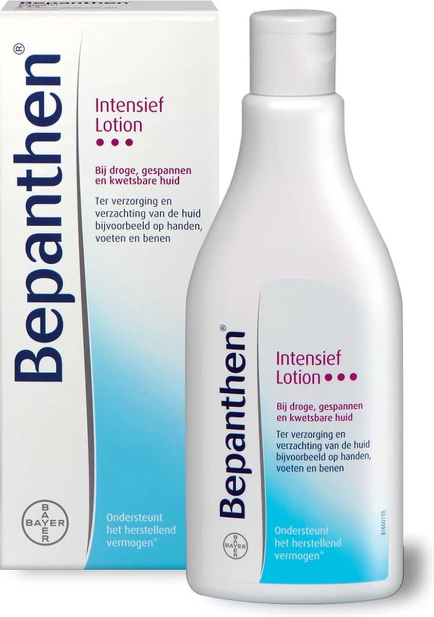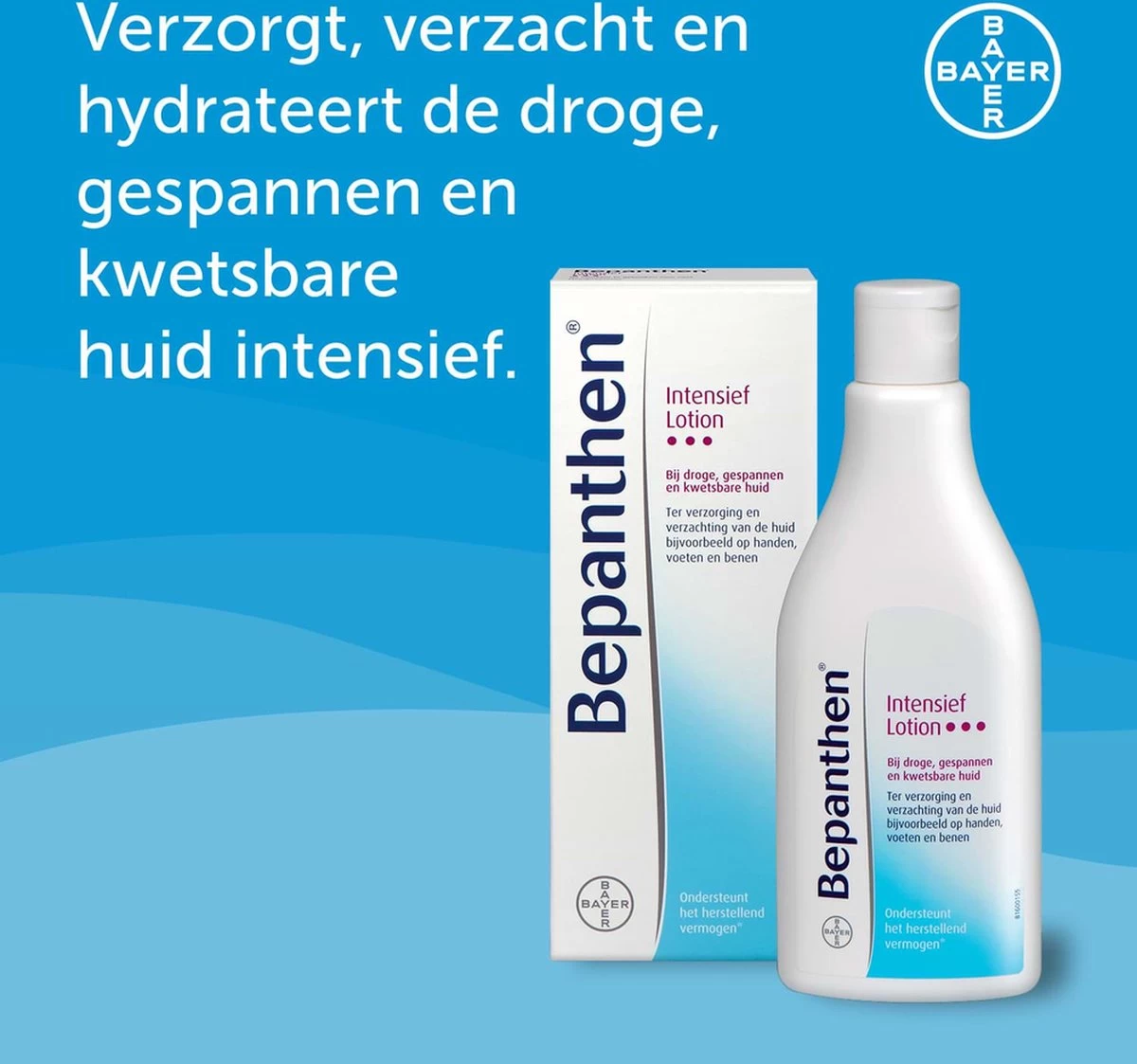 Bepanthen Intensief Lotion is een zachte, vette lotion (bodylotion, body lotion) die het natuurlijke huidherstel dagelijks intensief ondersteunt*. Door aanvulling te geven op natuurlijke huidvetten legt Bepanthen Intensief Lotion ook een beschermend laagje op de kwetsbare huid, droge huid en ruwe huid zonder haar af te sluiten. De verzorging verzacht en hydrateert de huid van je armen, benen en buik. Je huid voelt snel weer soepel aan. De lotion bevat een zacht geurend parfum wat zorgt voor een heerlijk luxe gevoel.