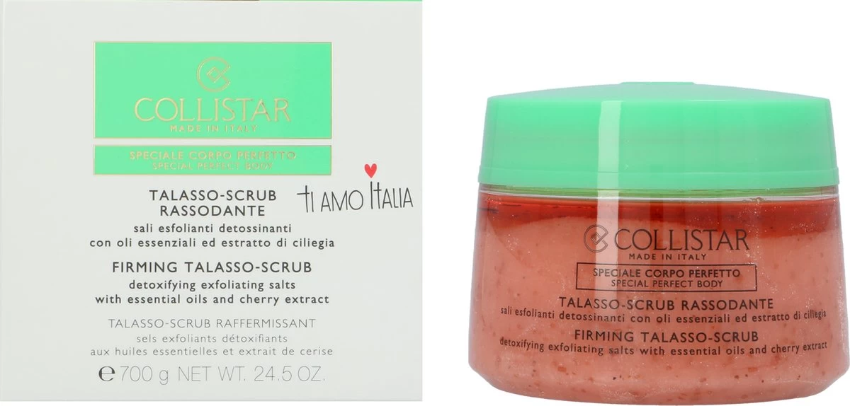 Ervaar de Mediterrane sensatie van Collistar’s Firming® Talasso Scrub met regenererende exfoliërende zeezouten, kersenextract, essentiële oliën en vitamine E. Deze verstevigende lichaamsscrub combineert de voordelen van thalassotherapie met de ontgiftende en verstevigende effecten van kers. Een verwennende behandeling die de huid verstevigt en zorgt voor een ongelooflijk zachte, gladde en stralende huid.