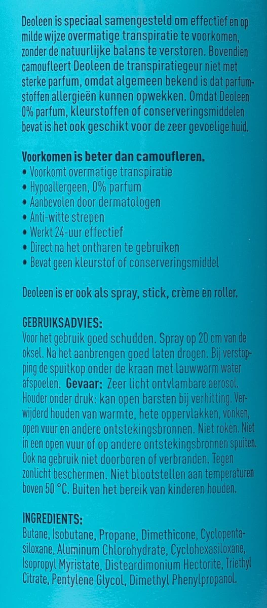 Deoleen Regular Spray is speciaal samengesteld om effectief en op milde wijze overmatige transpiratie te voorkomen, zonder de natuurlijke balans te verstoren. Deoleen camoufleert de transpiratiegeur niet met sterke parfum, aangezien parfumstoffen allergieën kunnen opwekken. In plaats daarvan neutraliseert Deoleen de transpiratiegeur door ongewenste bacteriegroei te voorkomen. Deoleen, Voorkomen is beter dan camoufleren.