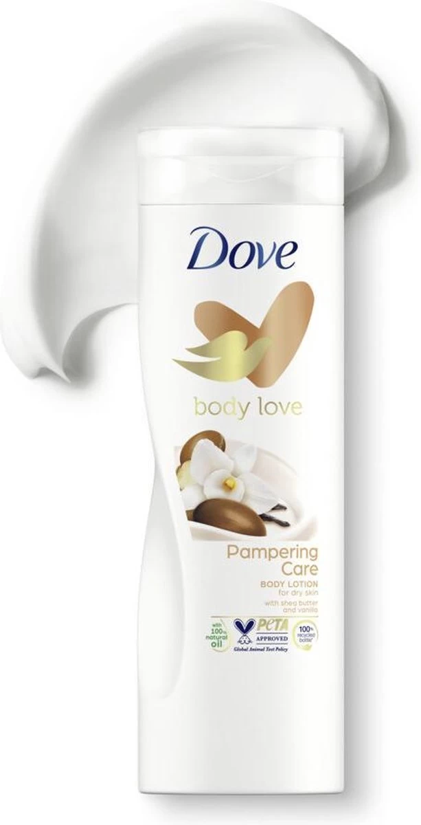 Bescherming tegen een droge huid begint met je huid de zorg te geven die het verdient. Dove Body Love Pampering Care Bodylotion is geformuleerd met 100% natuurlijke oliën. Deze rijke bodylotion is verrijkt met sheaboter, die de huid helpt te herstellen en diep te voeden. Voor een gehydrateerde, verwende en zachte huid die er mooi uitziet. Naast sheaboter bevat deze lotion ook de warme geur van vanille. Laat je omhullen door deze heerlijke geur, voel je weer in balans en kom tot rust na een zware, lange dag. Jezelf verzorgen heeft nog nooit zo goed gevoeld (en je huid nog nooit zo zacht).