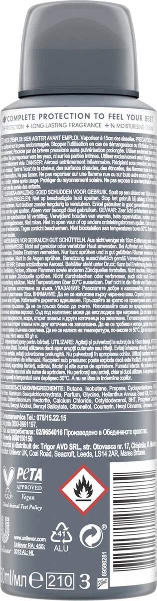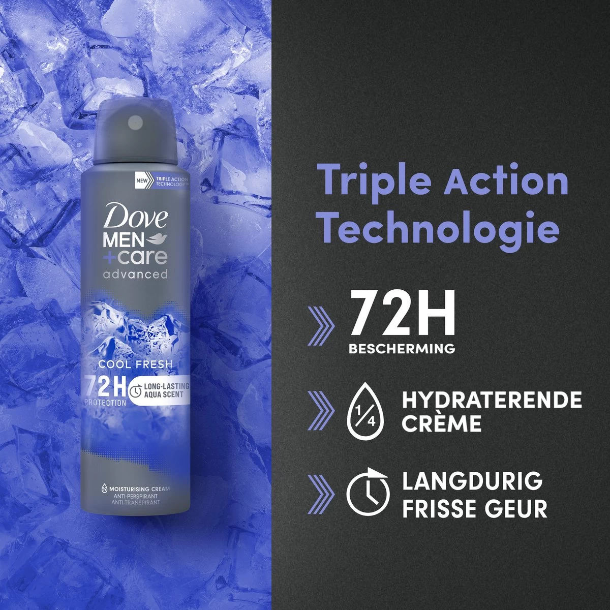 De Dove Men+Care Advanced Cool Fresh Anti-Transpirant Deodorant Spray beschermt 72 uur lang tegen zweet en geurtjes, heeft een langdurig frisse geur en verzorgt je oksels. Het bieden van bescherming komt op de eerste plaats bij deze anti-transpirant spray. Gemaakt met de revolutionaire Triple Action Technologie, is deze anti-transpirant ontworpen om je tot 72 uur lang tegen zweet en geur te beschermen. Met een frisse, mannelijke geur om je langdurig fris en zelfverzekerd te voelen. Deze Dove Men+Care anti-transpirant is verrijkt met onze unieke ¼ hydraterende crème, die je okselhuid verzorgt. Irritaties door zweet en scheren behoren tot het verleden. Je krijgt een gehydrateerde en beschermde huid en gladde, comfortabel aanvoelende oksels.