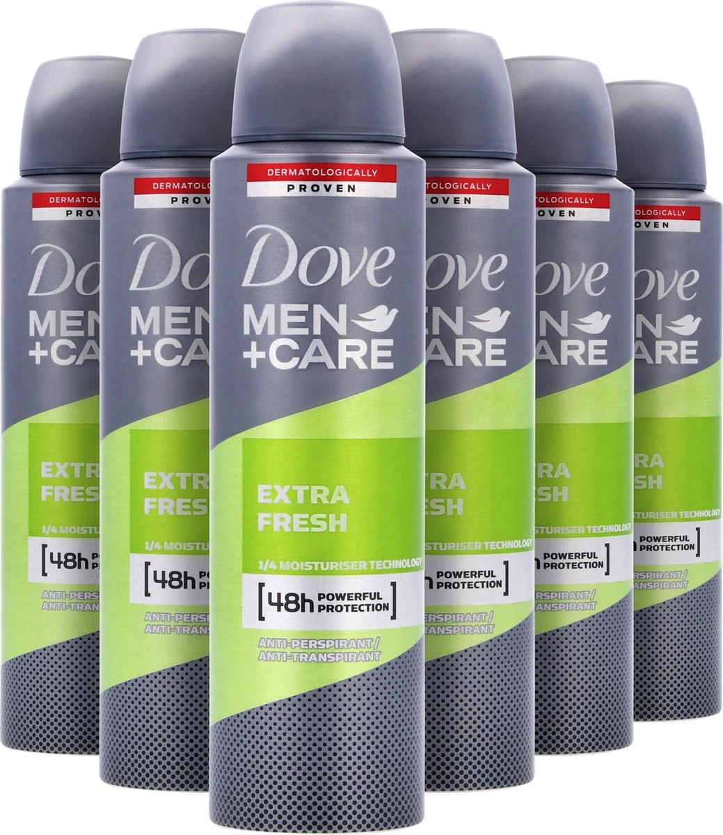 Dove Men+Care anti-transpirant spray is hard tegen zweet, maar zacht voor de huid. Als je regelmatig onderweg bent en veel sport, waardeer je het gemak van een langdurig werkende deodorant spray. Dankzij de dermatologische geteste formule van Dove Men+Care Extra Fresh anti-transpirant spray ben je tot 48 uur krachtig beschermd tegen zweet en ongewenste lichaamsgeuren. Bovendien bevat het de 1/4 hydraterende crème van Dove, die de huid verzorgt en beschermt tegen irritatie onder de oksels. Het extra frisse parfum is de hele dag subtiel aanwezig. Geen compromissen op het gebied van kwaliteit, kracht of comfort.