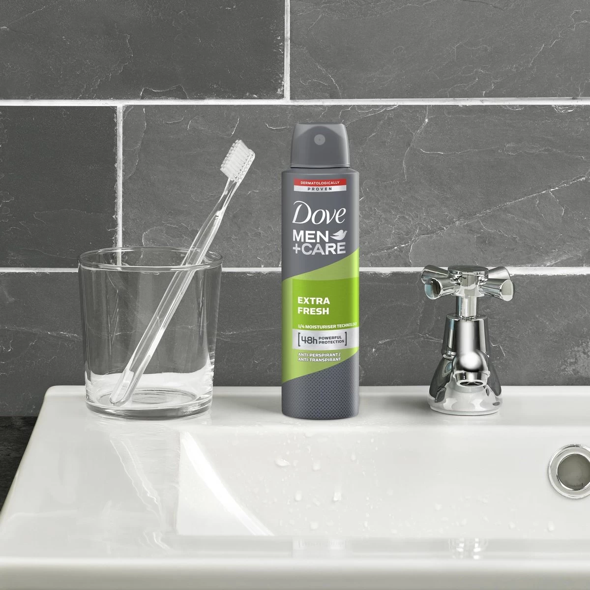 Dove Men+Care Extra Fresh anti-transpirant spray met 1/4 hydraterende crème van Dove, die de huid tegen irritaties beschermt.