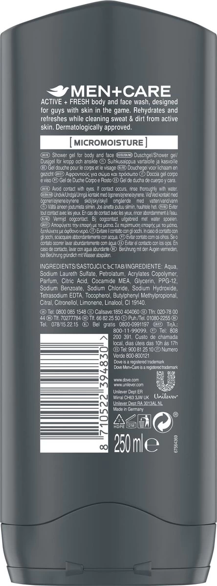 De Men+Care Sport Active+Fresh douchegel is speciaal ontwikkeld voor de mannenhuid voor gebruik na het sporten. Het reinigt zweet en vuil van de actieve huid voor een fris, schoon gevoel. Deze douchegel laat je huid niet alleen verfrist aanvoelen, maar zorgt ook voor hydratatie en huidverzorging. Alle Dove Men+Care douchegels bevatten MicroMoisture dat op de huid wordt geactiveerd en helpt tegen het uitdrogen van de huid na het douchen. Dove Men+Care Sport Active+Fresh is een hydraterende douchegel die de prestatie levert die jij nodig hebt. Daarnaast verzorgt Dove Men+Care Sport Active+Fresh je huid zonder deze uit te drogen.