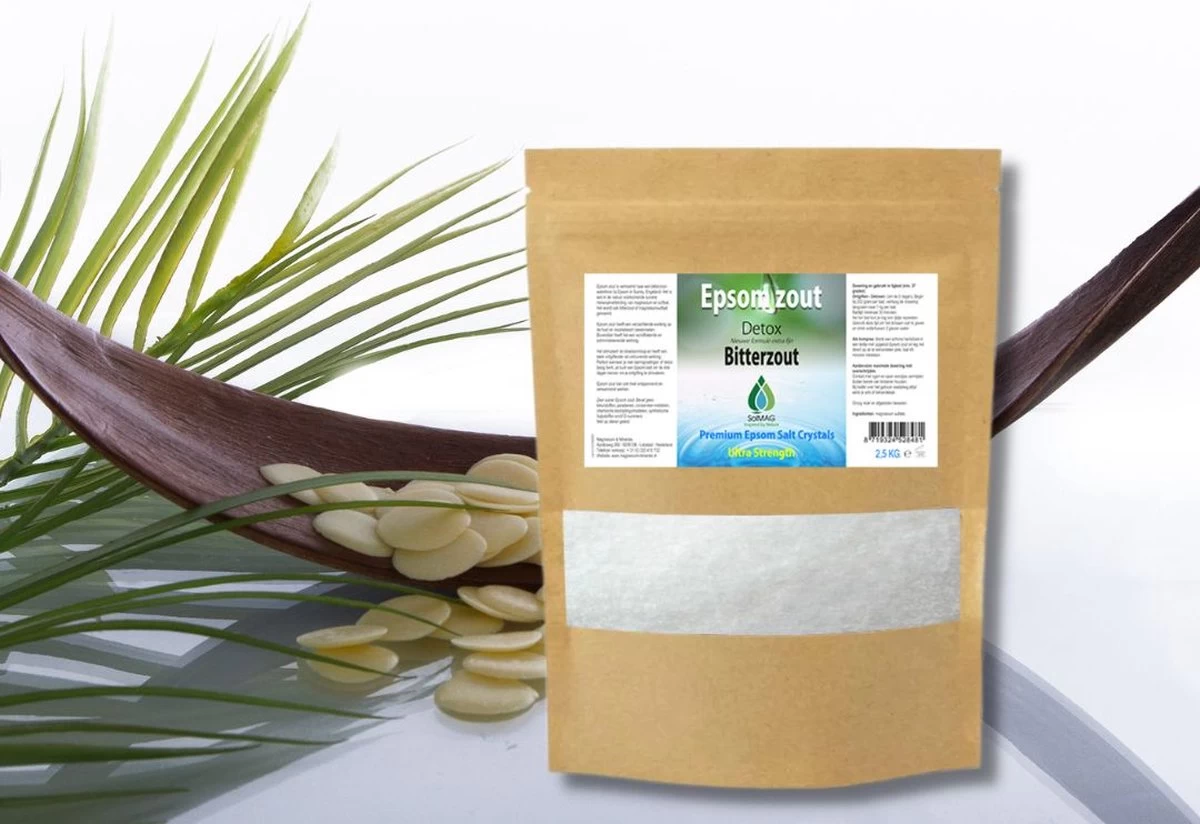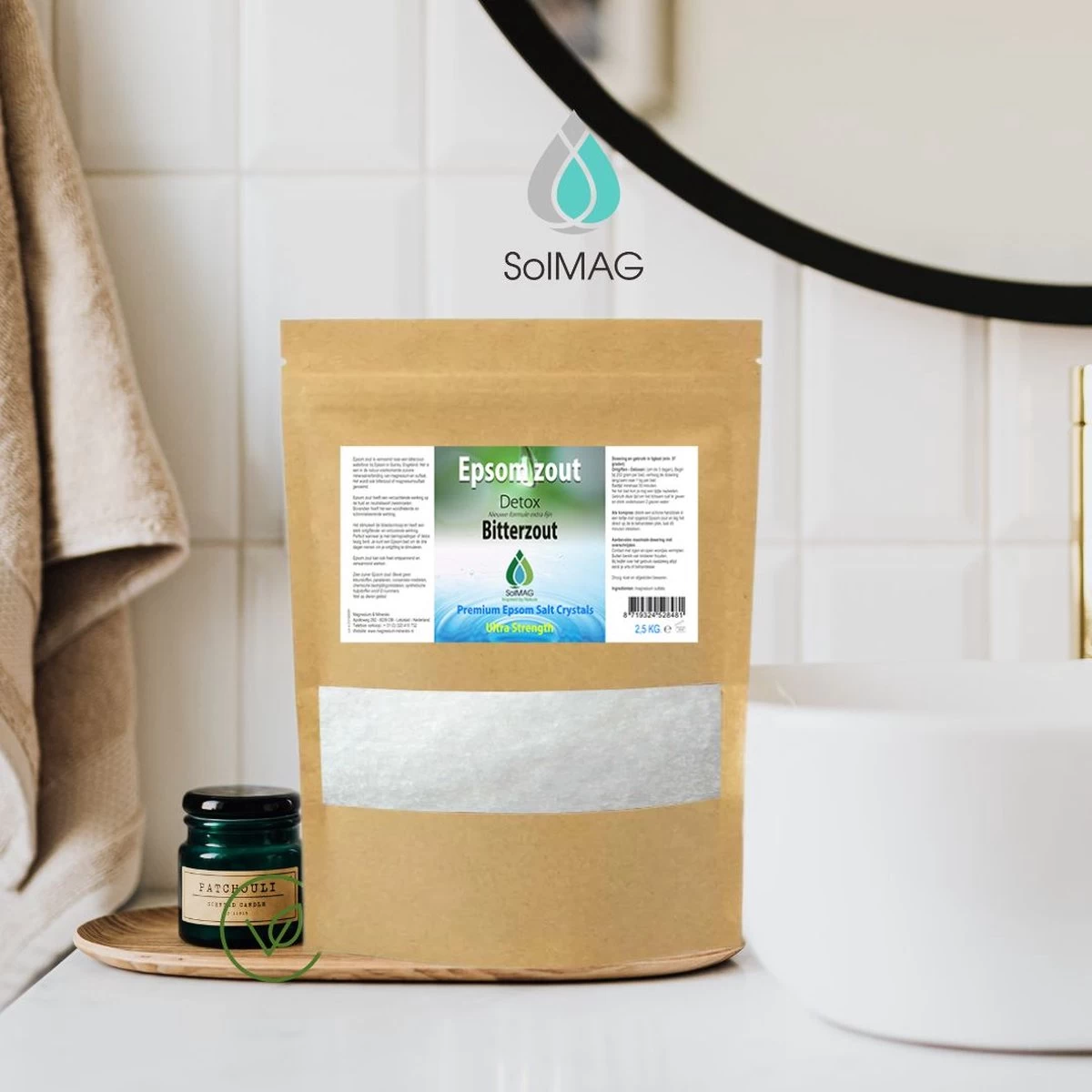 - 100% ZUIVER EPSOM ZOUT. SoLMAG Epsom Zout is vrij van conserveringsmiddelen, kleurstoffen en het bevat geen synthetische geuren of schadelijke chemische elementen.