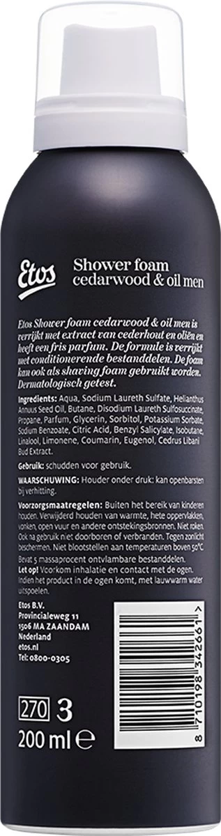 Etos Shower foam cedarwood & oil men 200 ml is verrijkt met extract van cederhout en oliën en heeft een fris parfum. Deze romige foam