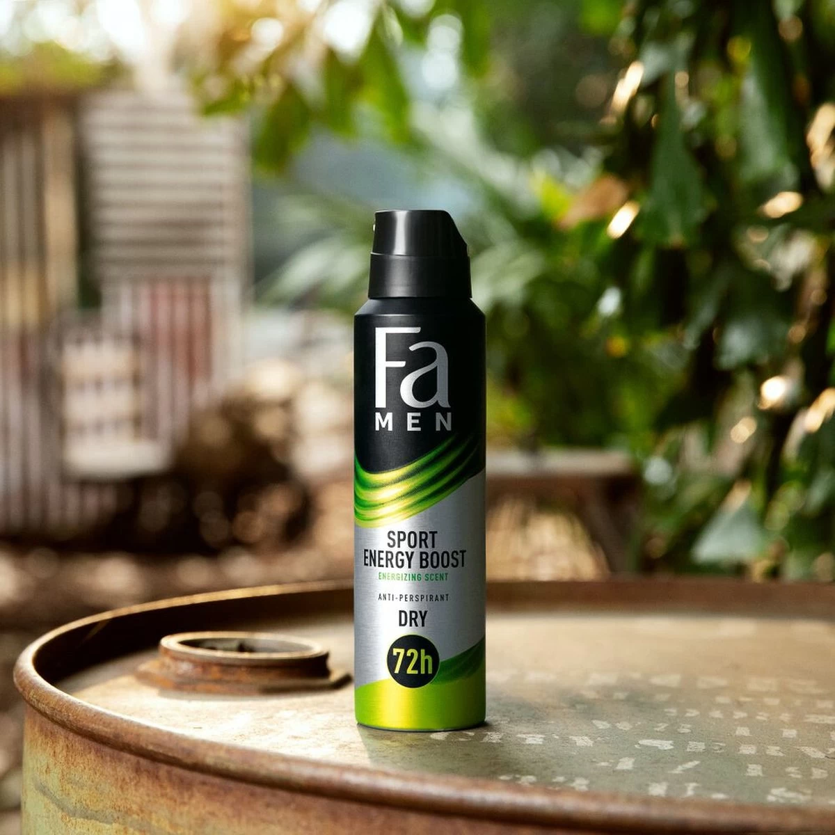 Ontdek Fa Men Sport Energy Boost anti-transpirant spray met de geur van gember & limoen. De vegan formule biedt 72 uur bescherming tegen zweet & nare geurtjes en bevat 0% alcohol.