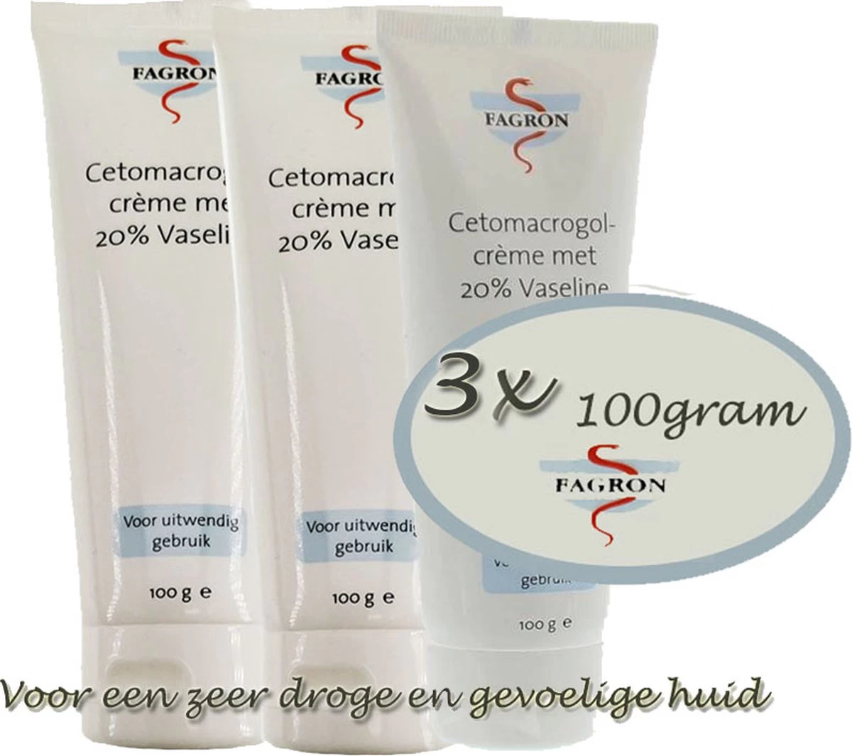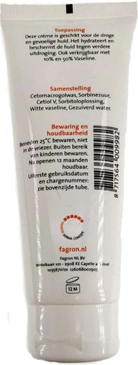 Fagron Cetomacrogolcrème met 20% Vaseline heeft een hydraterende en beschermend effect bij een zeer droge en gevoelige huid.