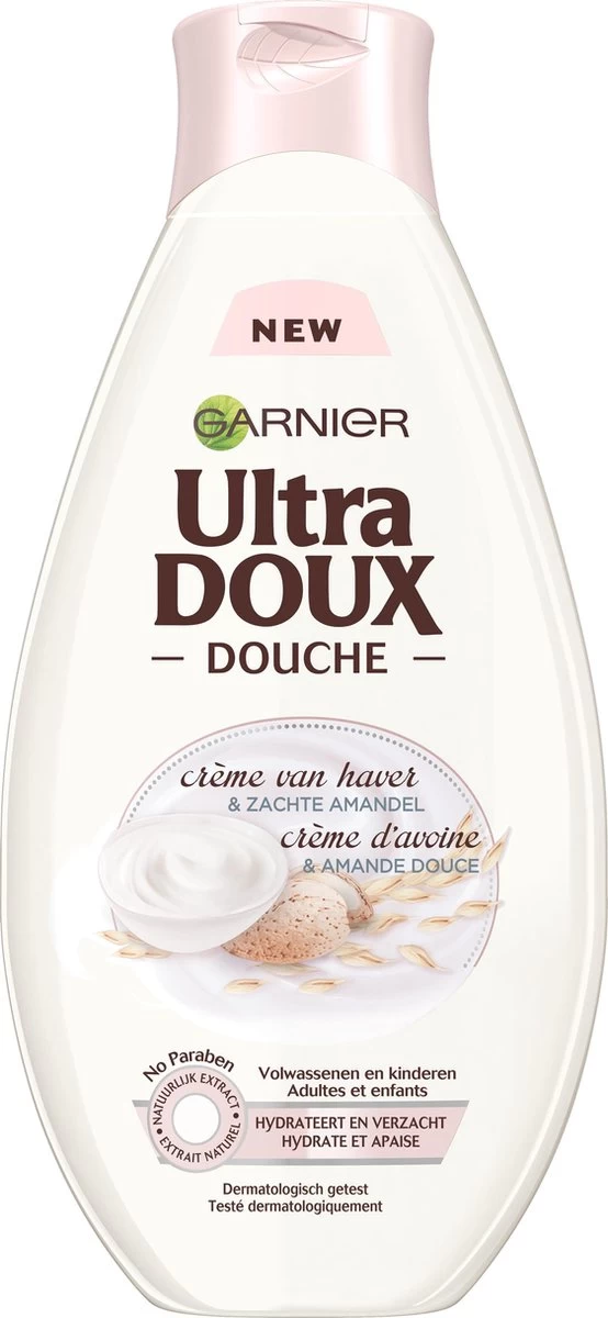 In zijn nieuwe kalmerende recept combineert Garnier Ultra Doux twee zachtheidsgeheimen. Haverroom, een veelbelovend graan met voedende eigenschappen, in combinatie met zachte amandel, om de huid te kalmeren en te beschermen tegen een trekkend gevoel. Na de douche blaakt uw huid van gezondheid. Neutrale pH voor de huid. Onder dermatologische controle getest.