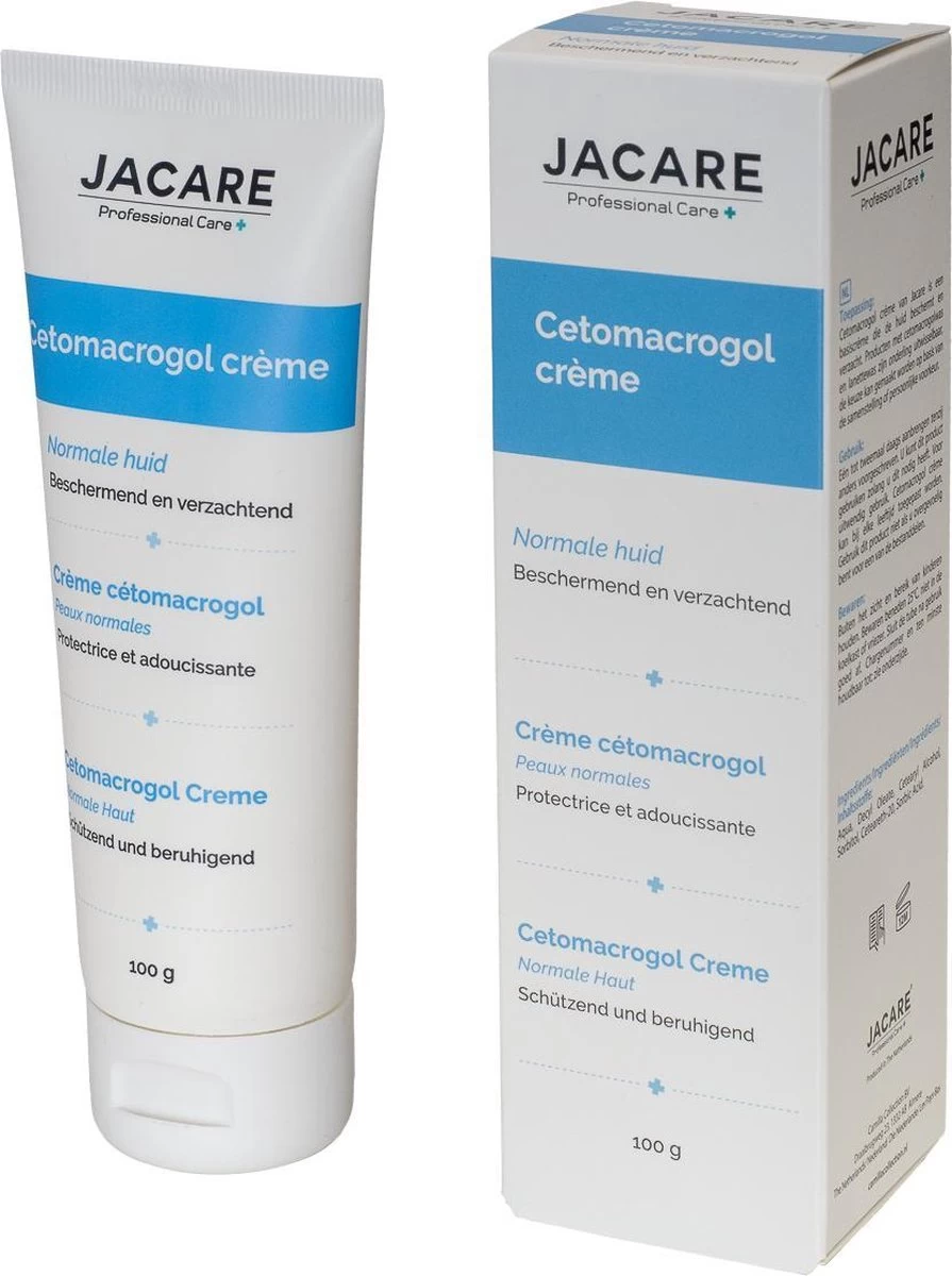 Jacare Cetomacrogol Crème verzacht en beschermt de huid tegen uitdrogen. De crème is geschikt voor de normale tot droge huid en trekt snel in. Bij een (wat) drogere huid is een cetomacrogol crème met vaseline aan te bevelen. De samenstelling is conform FNA.