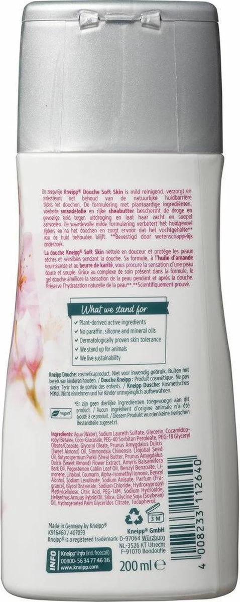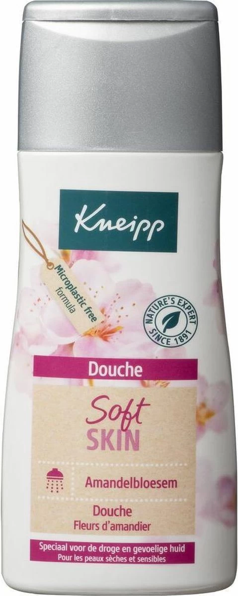 Kneipp® douche Soft Skin – Amandelbloesem is een mild reinigende en verzorgende douchegel die speciaal geschikt is voor de gevoelige huid. Door de voedende amandelolie en rijke sheabutter blijft het vochtgehalte van de huid op peil* en wordt uitdroging van de huid voorkomen. Ook biedt deze zeepvrije douche extra ondersteuning voor het behoud van de natuurlijke huidbarrière. Geniet van de heerlijke geur en een zachte soepele huid na het douchen.