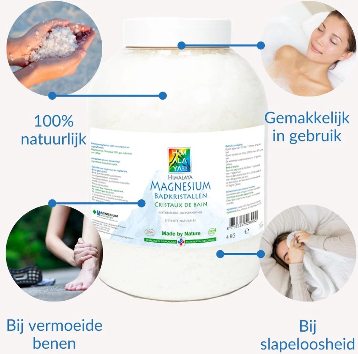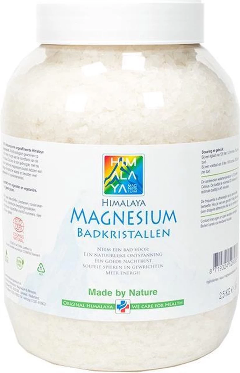Himalaya magnesium vlokken bestaat uit 47% natuurlijke ongeraffineerde magnesiumchloride met zuiver bronwater uit het Himalaya gebergte. Himalaya magnesium vlokken/badkristallen zijn 100% natuurlijk, zeer zuiver en een weldaad voor je lijf. Te gebruiken in een ontspannen voetbad of een heerlijk ligbad. Terwijl je ontspant verhoog je je magnesiumgehalte. Himalaya magnesium bevat minstens 30 gram elementair magnesium per 250 gram.