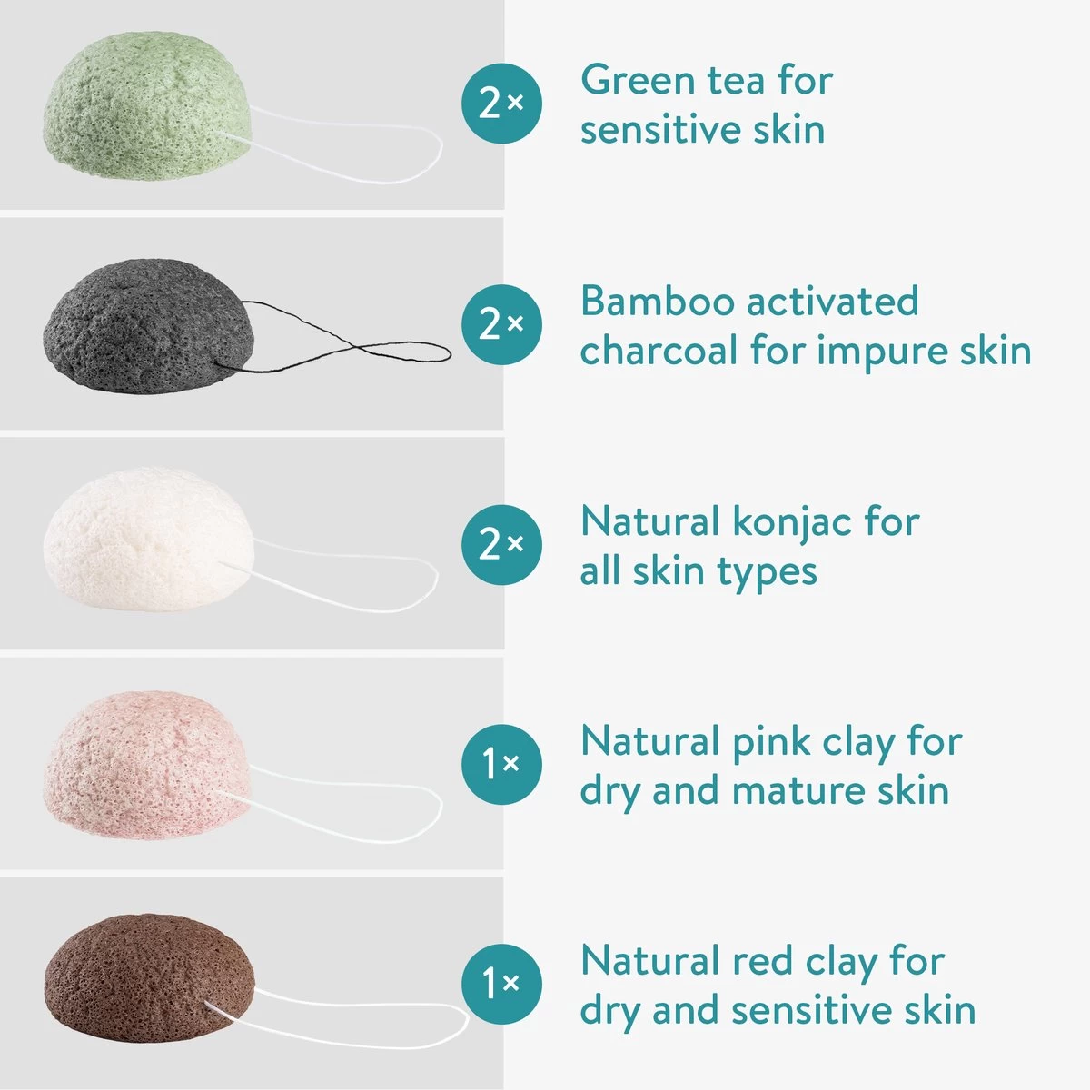 - VOOR 5 VERSCHILLENDE HUIDTYPES: Roze klei voor de rijpe en/of droge huid, rode klei voor de gevoelig droge huid, bamboe voor voor de gemengde/onzuivere huid, groene thee voor de gevoelige huid en de witte konjac spons is geschikt voor elke huid.