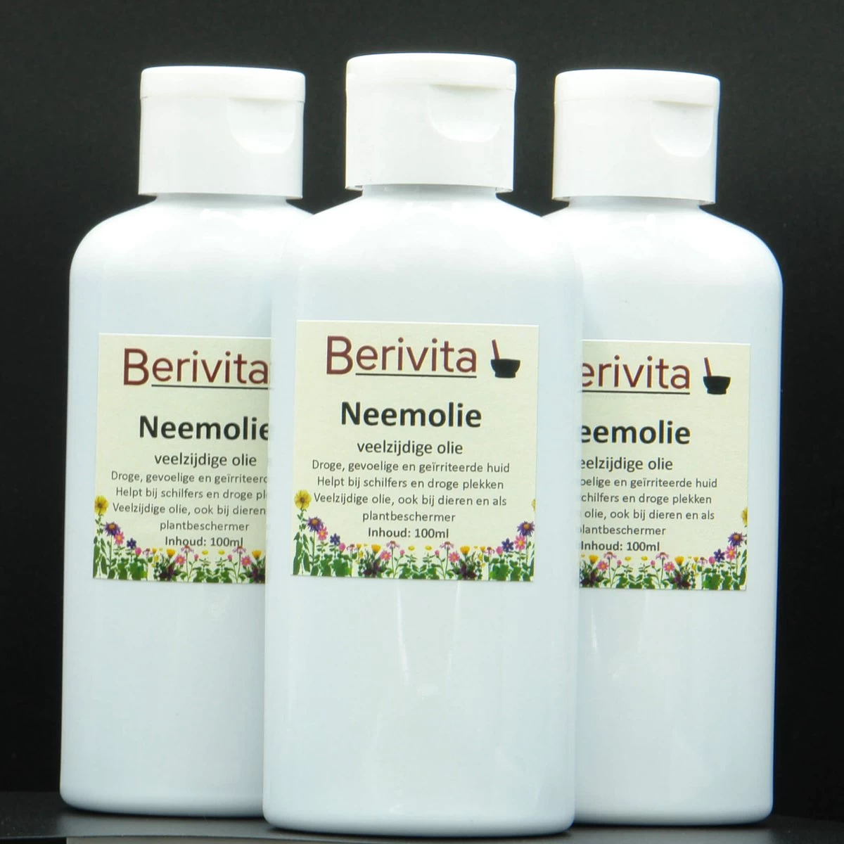 3x100ml flessen met hoge kwaliteit 100% pure Neemolie, in handige flessen van 100ml, met klepdopje. Deze natuurlijke en plantaardige Neemolie wordt gewonnen door koude persing van zaadjes uit Neemvruchten, afkomstig van de Azadirachta indica boom.