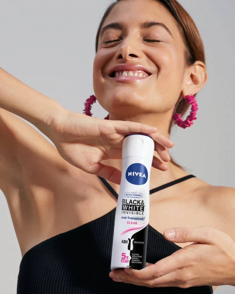 NIVEA Invisible For Black & White Clear Anti-Transpirant is de eerste anti-transpirant die zowel witte strepen op donkere kleding als ook gele vlekken in lichte kleding voorkomt. Geeft 48 uur lang betrouwbare bescherming tegen transpiratie en lichaamsgeur en biedt de milde verzorging van NIVEA.