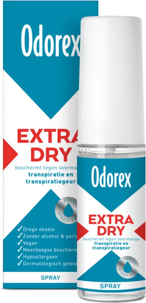 Odorex Extra Dry spray voor een langdurige werking en verzachte verzorging.