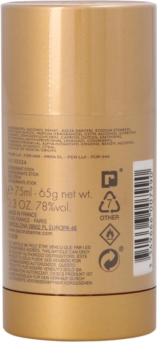 De Paco Rabanne 1 million deodorant stick geeft je langdurende bescherming met de heerlijke geur van 1 Million. De ingrediënten van One Million zijn onder andere sinaasappel, grapefruit, munt, kaneel, roos, kruiden, leder, houtkenmerken, amber en patchoeli. Deze heerlijke mix van ingrediënten zorgen voor een mannelijke en sensuele geur.