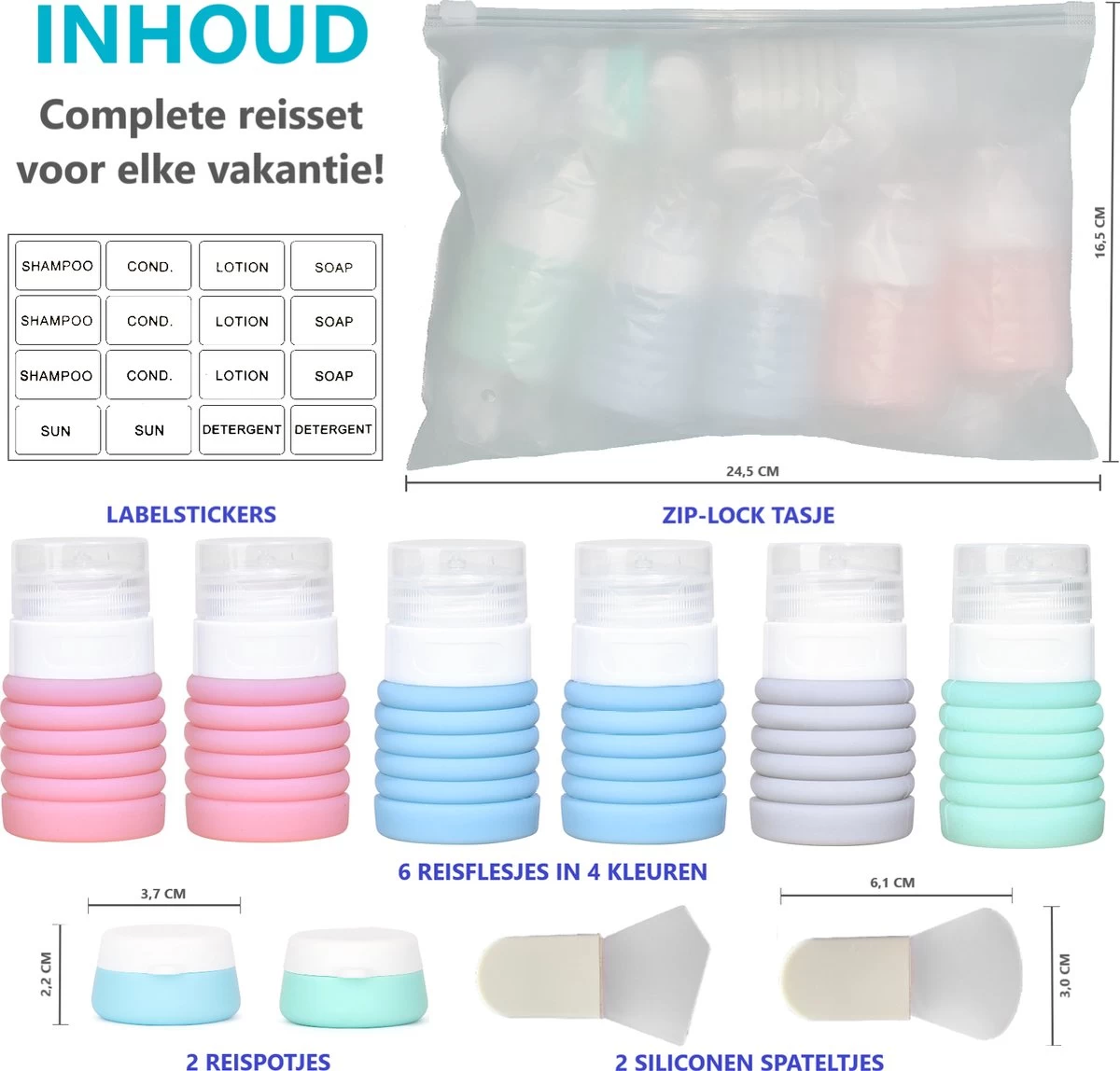 De meest complete reisset voor al je benodigdheden! Vind je het ook zo vervelend als je in je handbagage je douche- en badspullen niet kan meenemen? Dan zijn deze reisflesjes dé must-have voor jou! Deze reisflacons zijn klein genoeg om mee te mogen in de handbagage. Zo kun je dus je favoriete douchespullen gewoon meenemen op vakantie! Gebruik de siliconen flesjes voor shampoo, body wash, conditioner of zelfs zonnebrand. De siliconen potjes kun je gemakkelijk gebruiken voor de crèmepjes. Met de meegeleverde siliconen spateltjes schep je de inhouw makkelijk over, en de anti-lek dop kan makkelijk van de reisflesjes worden geschroefd. Met 4 verschillende kleuren maak je makkelijk onderscheid wat waar in zit of welk reisflesje van wie is. Gebruik je ze allemaal voor andere producten? Gebruik dan de meegeleverde labelstickers om aan te geven wat waar in zit. Zijn de flesjes leeg aan het eind van je vakantie. Schuif deze dan makkelijk weer in om ruimte te besparen in je koffer!