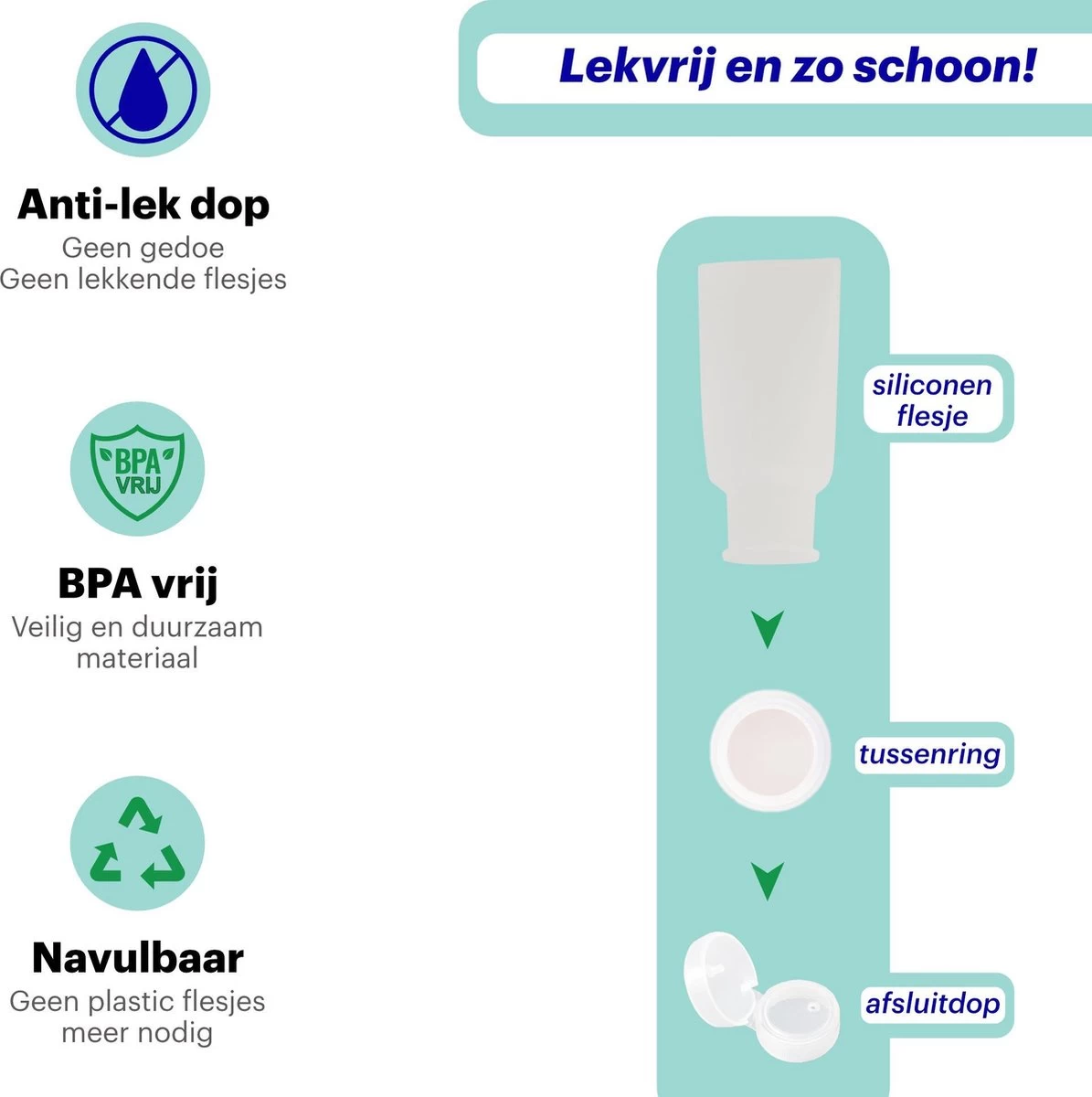 Een lekkende flacon, daar zit je niet op te wachten tijdens jouw vakantie. De Qpacks flacons hebben een anti-lek dop om deze onaangename verassingen te voorkomen. Omdat het siliconen gedeelte zeer buigzaam is, kan deze goed tegen een stootje én kun je de laatste vloeistof gemakkelijk uit het flesje knijpen.