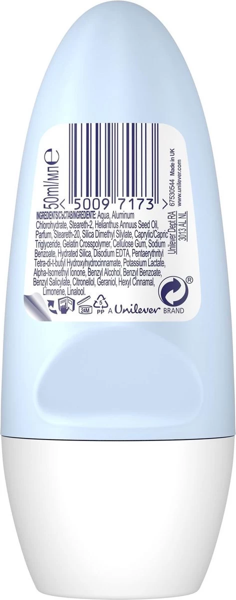 Rexona Women Cotton Dry anti-transpirant roller is geformuleerd om 48 uur bescherming te bieden tegen zweet en geur met een alcoholvrije formule, zodat je je de hele dag fris, droog en beschermd voelt. Deze anti-transpirant deodorant heeft een lichte, frisse geur geïnspireerd door verse katoenen lakens, zodat je het zelfvertrouwen kunt hebben om de hele dag lang te blijven bewegen terwijl je je fris en droog voelt. De zachte, frisse geur van katoen blijft bij je, hoe hard je jezelf ook pusht. Rexona Women Cotton Dry anti-transpirant roller bevat Rexona’s innovatieve MotionSense technologie, die je een uitbarsting van lichte, bloemige geur geeft wanneer je deze het meest nodig hebt. Het werkt als volgt; unieke microcapsules hechten zich aan het oppervlak van je huid. Wanneer je beweegt, breekt de wrijving de microcapsules en geven ze meer geur vrij. Dus hoe meer jij beweegt, hoe meer het beschermt. Ervaar de hele dag door frisheid en 48 uur bescherming ’s morgens tot ’s avonds met Rexona Women Cotton Dry anti-transpirant roller om zweet en geur op afstand te houden. Rexona. Daar kun je op vertrouwen. Hoe te gebruiken: Zorg ervoor dat je oksels droog zijn voor het aanbrengen. Rol in ciruclaire bewegingen en zorg ervoor dat de dekking gelijk is voor iedere oksel. Vermijd contact met ogen en beschadigde huid. (ehtylalcohol)