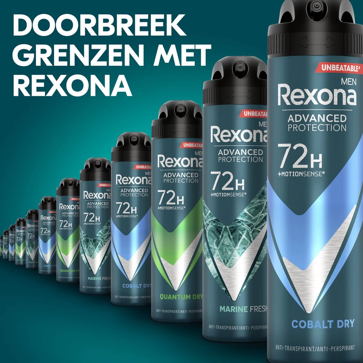 Rexona Men Advanced Protection Cobalt Dry Anti-Transpirant Spray biedt tot 72 uur geavanceerde bescherming tegen zweet en ongewenste lichaamsgeur.
