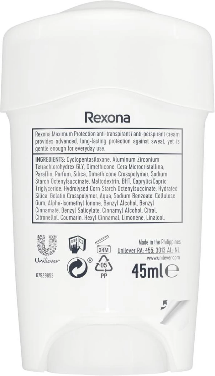 Rexona Women Maximum Protection Clean Scent Anti-Transpirant Stick is een anti-transpirant die speciaal is ontwikkeld om een zeer krachtige bescherming te bieden aan iedereen die het nodig heeft. Dankzij de langwerkende formule ben je tot 96 uur lang beschermd tegen overmatige transpiratie en nare geurtjes. Maximum Protection bevat de Defence+ Technologie. Dit krachtige actieve bestanddeel kan het beste aangebracht worden voor het slapengaan. Op dit moment zijn je zweetklieren minder actief waardoor de formule kan reageren op de stoffen in je lichaam. Op deze manier ben je de volgende dag maximaal beschermd.