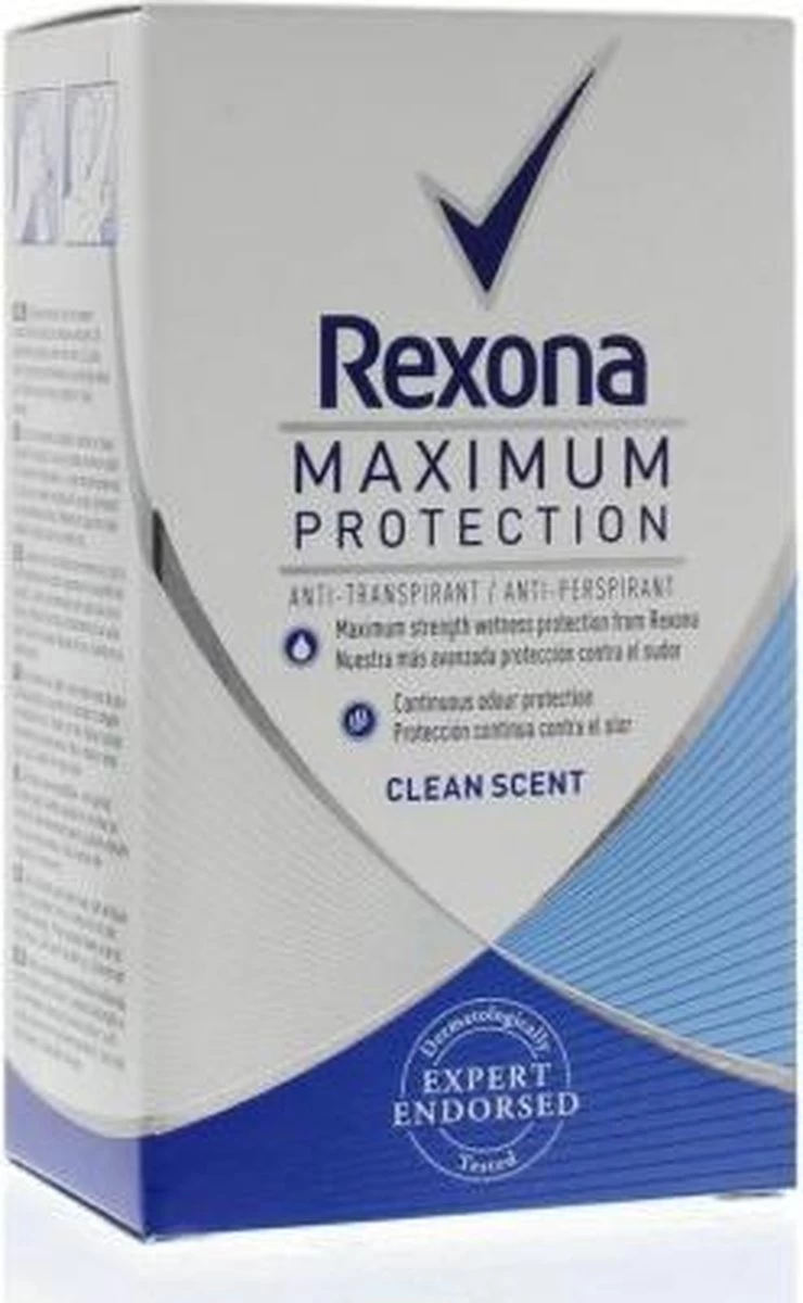 Rexona Women Maximum Protection Clean Scent Anti-Transpirant Stick is een anti-transpirant die speciaal is ontwikkeld om een zeer krachtige bescherming te bieden aan iedereen die het nodig heeft. Dankzij de langwerkende formule ben je tot 96 uur lang beschermd tegen overmatige transpiratie en lichaamsgeur.