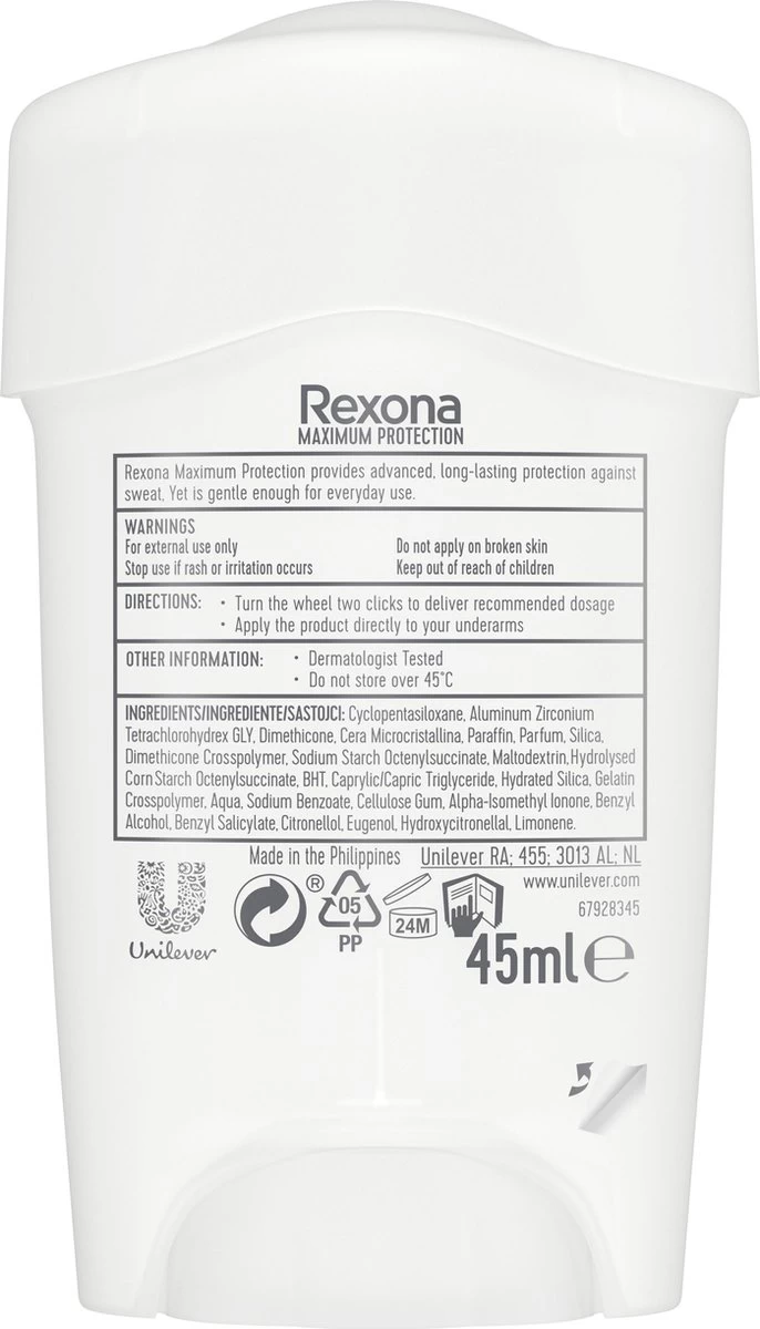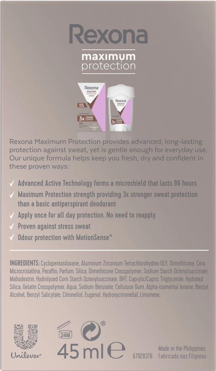 De Rexona Women Maximum Protection Confidence Anti-transpirant Stick voor vrouwen is een anti-transpirant stick die speciaal is ontwikkeld om een zeer krachtige bescherming te bieden aan iedereen die het nodig heeft. Dankzij de langwerkende formule ben je tot wel 96 uur lang beschermd tegen overmatige transpiratie en nare geurtjes. Rexona Maximum Protection bevat de innovatieve Defence+ Technologie. Dit krachtige actieve bestanddeel kan het beste aangebracht worden voor het slapengaan. Op dit moment zijn je zweetklieren minder actief, waardoor de formule kan reageren op de stoffen in je lichaam. Zo ben je de volgende dag maximaal beschermd. De actieve bestanddelen van de Defence+ Technologie gaan de vorming van nieuw zweet tegen, doordat de kleine actives een beschermlaagje over je zweetklieren leggen. Op deze manier bestrijdt de anti-transpirant de vorming van nare geuren en overmatige transpiratie. Rexona Maximum Protection Confidence biedt 3x meer bescherming dan onze reguliere anti-transpirant. Hierdoor ben je optimaal beschermd, tegen elke verrassing die de dag je brengt. Rexona Maximum Protection is verkrijgbaar in de vorm van een anti-transpirant stick, zodat het gemakkelijk aan te brengen is en bevat een frisse geur. Naast de Defence+ Technologie bevat de crème stick zeer effectieve hydraterende bestanddelen die ervoor zorgen dat hij geschikt is voor dagelijks gebruik. Voel je fris en schoon, de hele dag door. Wil je lang genieten van droge en frisse oksels? Dan kun je op Rexona vertrouwen. De Rexona Women Maximum Protection Confidence Anti-transpirant Stick gaat namelijk niet alleen nare geurtjes tegen, maar ook transpiratievocht. En dat tot wel 96 uur lang. Zo ga jij weer vol zelfvertrouwen de deur uit! Met Rexona blijf je fris, wat je ook doet. Rexona, daar kun je op vertrouwen.