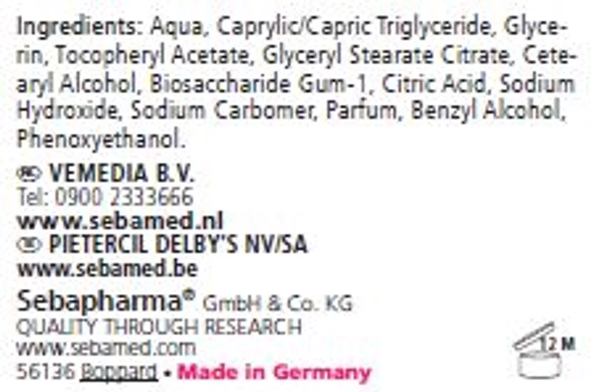 | Ingrediënten | Aqua, Caprylic/Capric Triglyceride, Glycerin,Tocopheryl Acetate, Glyceryl Stearate Citrate, CetearylAlcohol, Biosaccharide Gum-1, Citric Acid, Sodium Hydroxide, Sodium Carbomer, Parfum, Benzyl Alcohol,Phenoxyethanol |